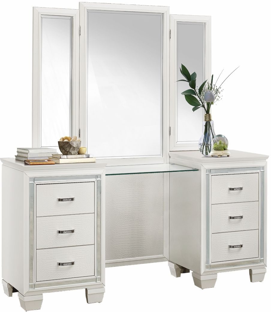 Glamour reigns in the design of the Allura Collection. Framing the vanity dresser and mirror is a decorative beveled mirror accent. Alligator embossing and high polished crystal-enhanced hardware boldly accent the white finish.