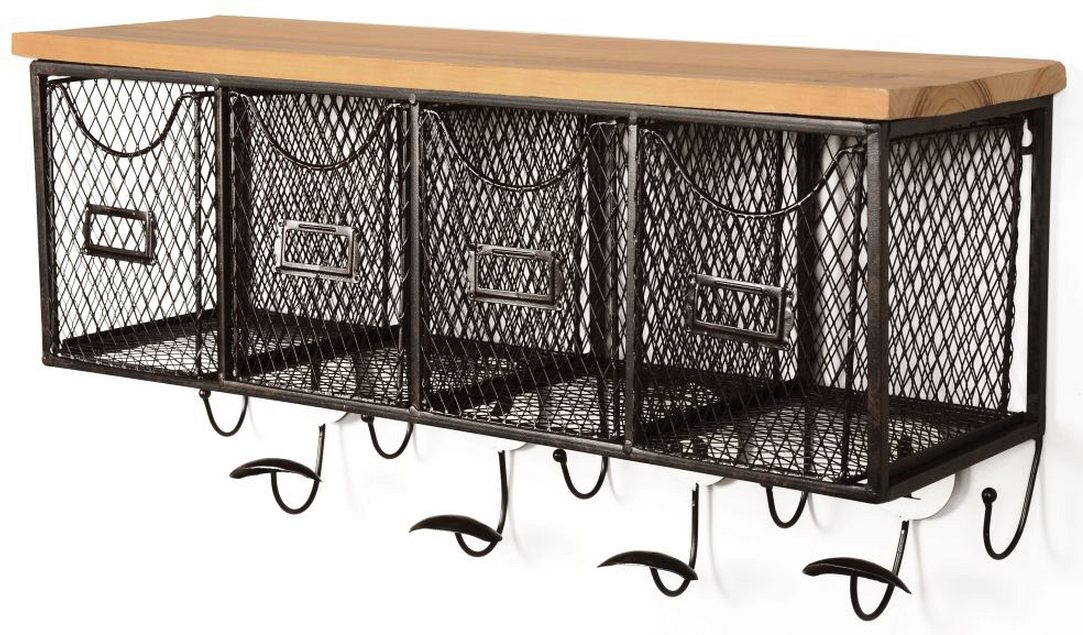 The Four Basket Wall Organizer will add storage to an area while saving valuable floor space. Four grid style metal baskets provide room for storing a variety of items. Nine storage hooks allow you to hang coats and bags. An antiqued stained wood top provides an additional area to display items. Perfect for an entry, office or hallway.