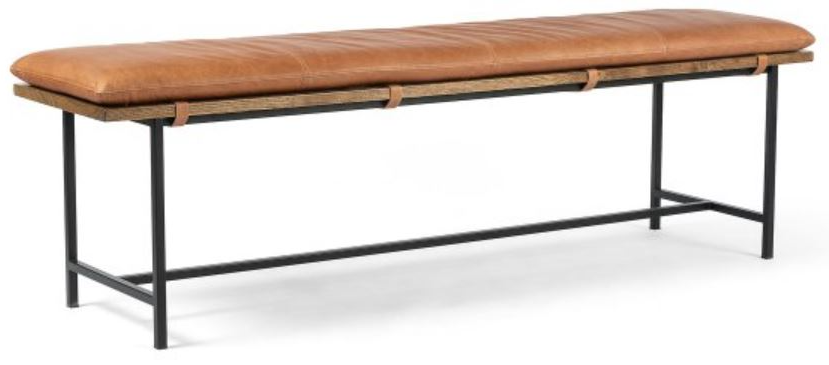 Inspired by French antiques, the Mylo bench features slim, black-finished iron legs supporting a nettlewood dining bench. A sophisticated cushion of cognac top-grain leather easily adheres via Velcro strapping, creating a comfortable seat at the table, in the entry, or at the foot of a bed.