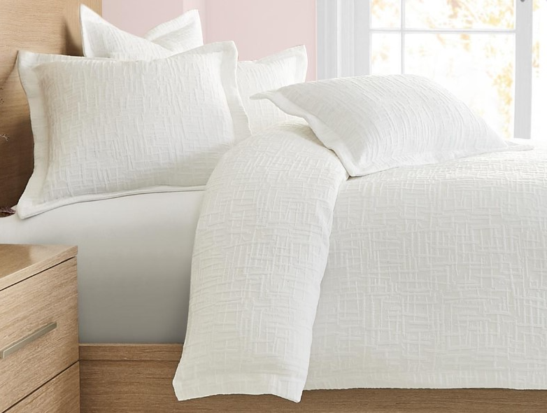 Manifest your inner serenity with the Hillton Duvet Set. Designed with a lovely raised linear texture, this bedding look showcases a soft architectural look within a casual style. The duvet has cotton/poly back fabric and button closure to easily secure an insert (not included), and the duvet and shams have 2-inch flanges.