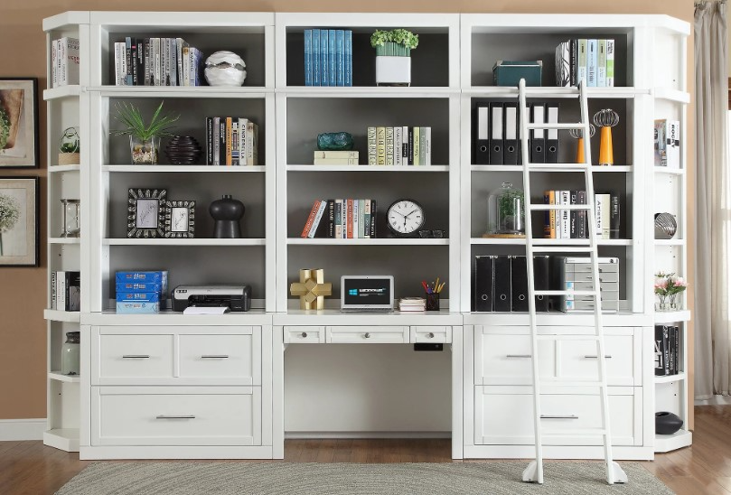 Creating the appearance of built in cabinets is easier than ever with this modular collection. This arrangement boasts plenty of library storage and shelf space for your home. The adjustable ladder glides smoothly on the joined ladder rails allowing easy access to the upper shelves and providing a great look in your room.