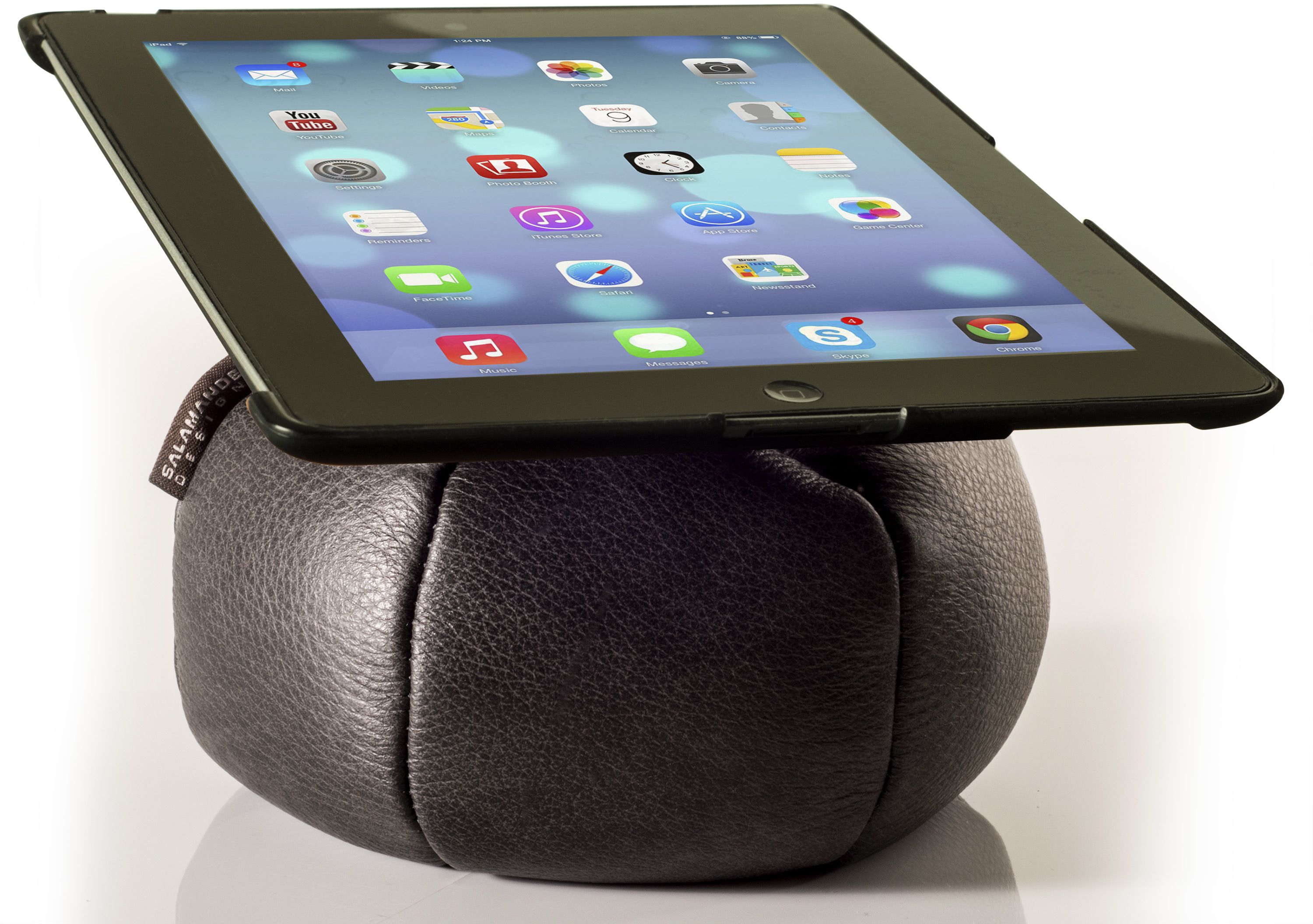The innovative iPad Bean Bag Stand features a convenient mounting interface that doubles as a protective backing when detached from the base. The handmade, real leather bag easily conforms to any flat or irregular surface to provide a leveled viewing angle when curled up on the couch or riding in the car-you can even squish the base beneath a headrest for ideal backseat viewing.