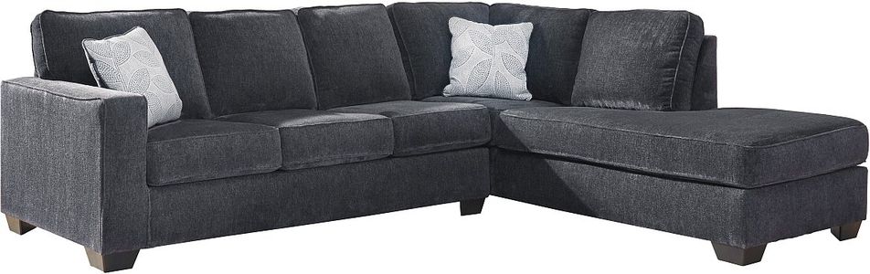 If style is the question, then this sectional is the answer. Sporting clean lines and sleek track arms, the decidedly contemporary profile is enhanced with plump cushioning and a chenille-feel upholstery that's so pleasing to the touch. This sectional in slate gray includes a pair of understated floral pattern pillows for fashionably fresh appeal.