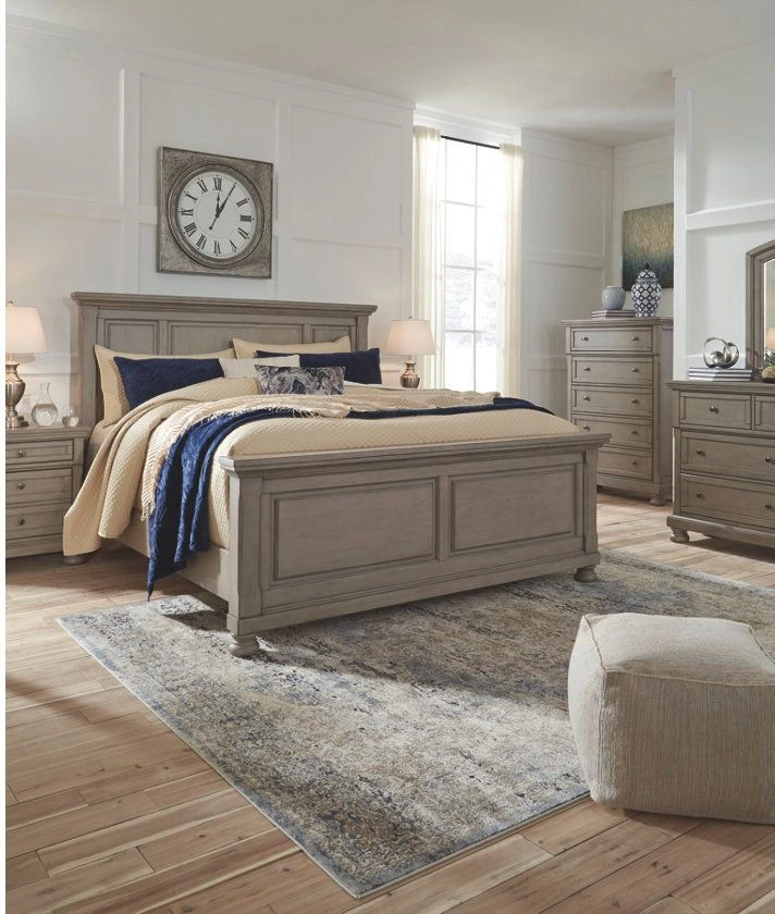 Satisfying your taste for tradition, this king panel bed sports serene sophistication. Forever classic design details—inlaid panels and bun feet—are so easy to love. Burnished light gray finish elevates the look with modern sensibility, so you can sleep in style. Mattress and foundation/box spring available, sold separately.
